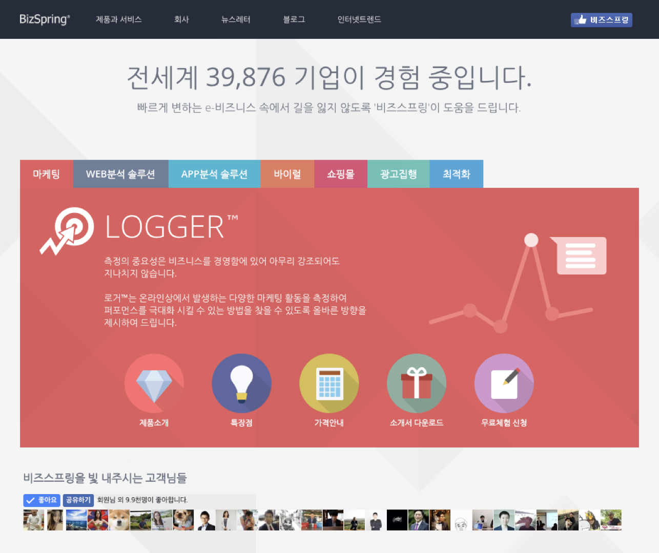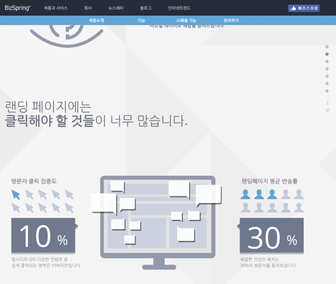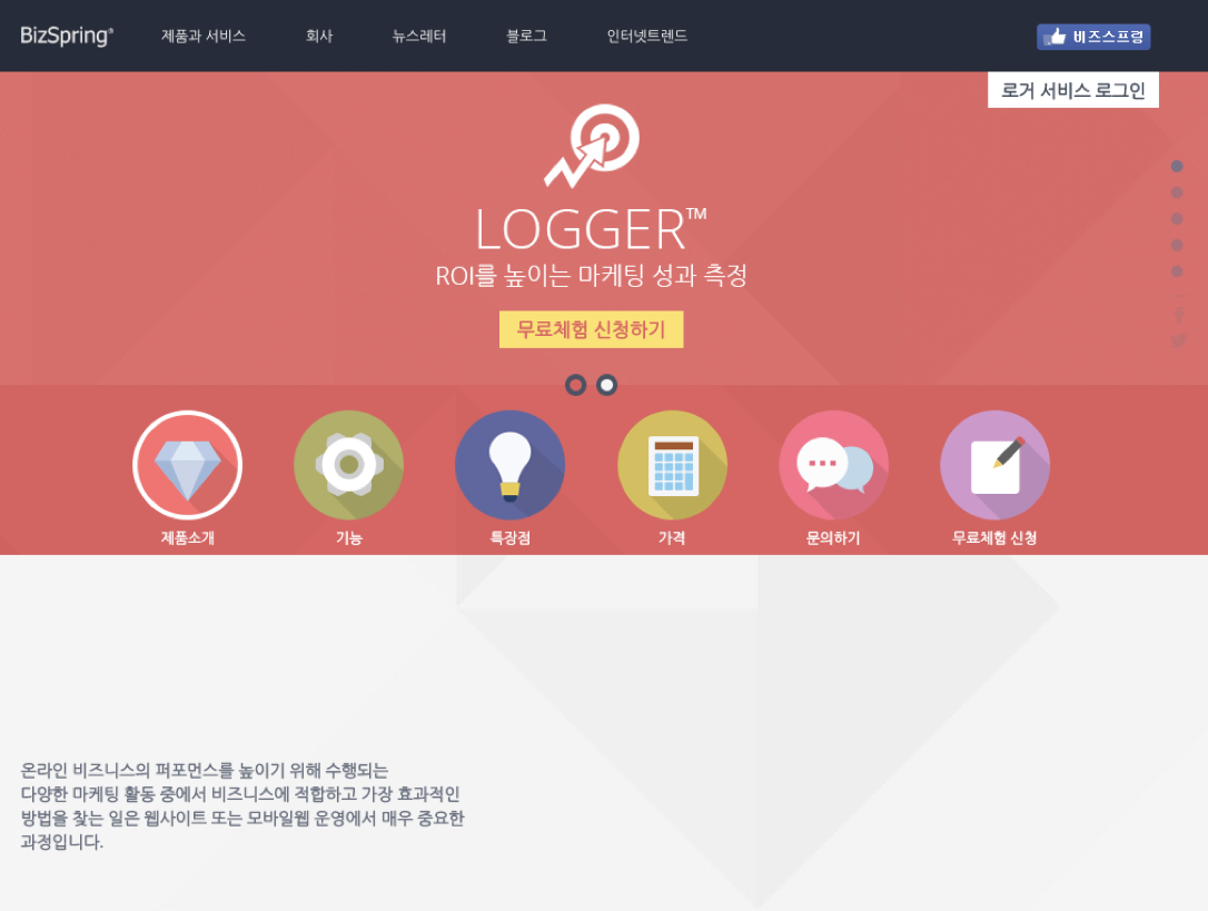 비즈스프링 웹사이트는 플랫 디자인과 함께 스크롤 반응형 애니메이션을 도입하였습니다.